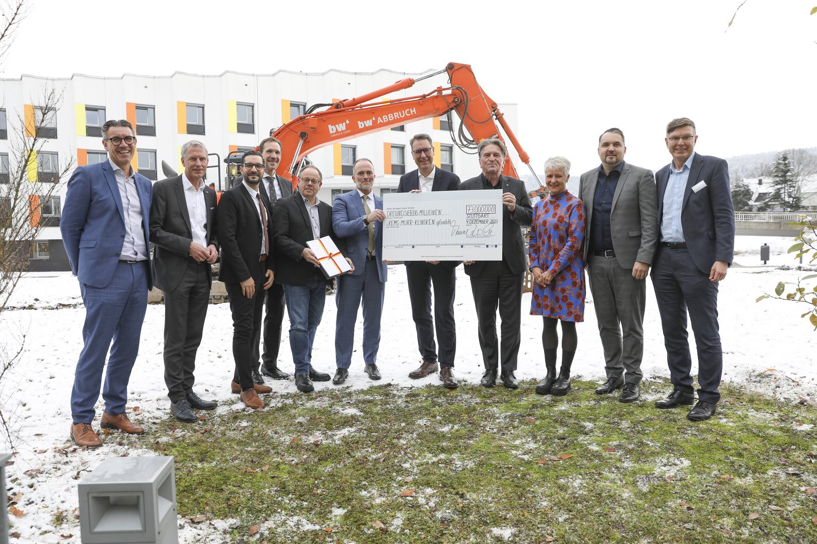 Der Bagger steht bereit: Feierliche Übergabe des Förderbescheids und der Baugenehmigung mit (v.l.n.r.) Thorsten Englert (Erster Bürgermeister Schorndorf), MdL Jochen Haußmann (FDP), Giancarlo Cannavo (Pflegedienstleitung Rems-Murr-Klinik Schorndorf), Dr. Christoph Ulmer (Ärztlicher Direktor Rems-Murr-Klinik Schorndorf), Bernd Hornikel (Oberbürgermeister Schorndorf), André Mertel (Geschäftsführer Rems-Murr-Kliniken), Dr. Richard Sigel (Landrat Rems-Murr-Kreis), Manne Lucha (Sozial- und Gesundheitsminister Baden-Württemberg), MdL Petra Häffner (GRÜNE), MdL Christian Gehring (CDU), Dr. Rainer Pfrommer (Klinikleiter Schorndorf).