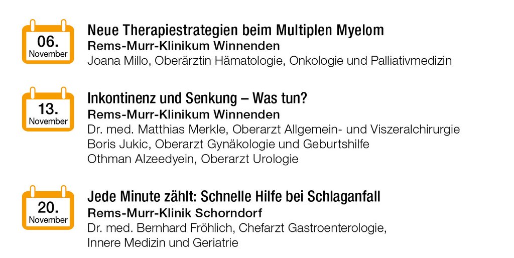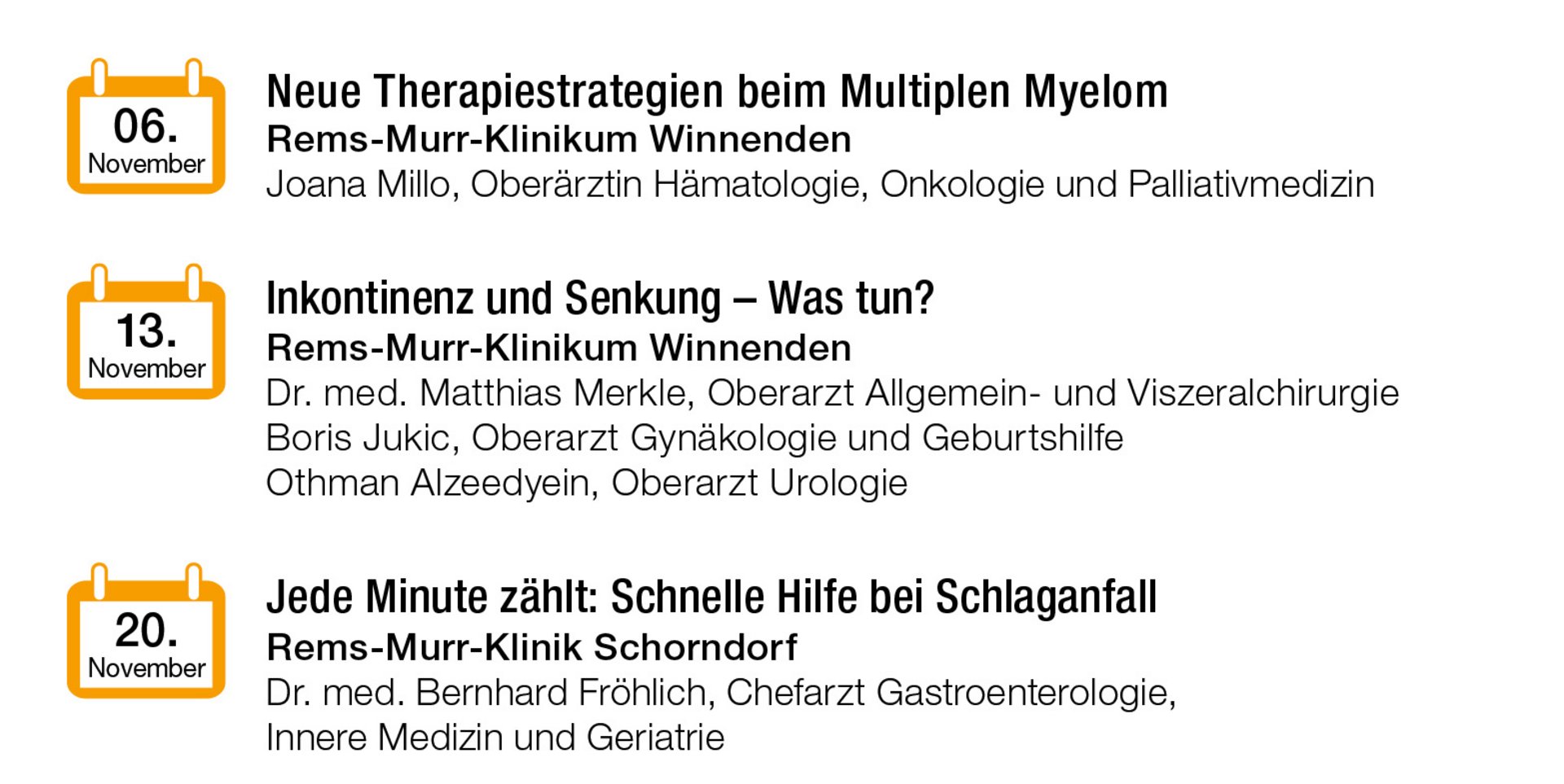 Winnenden/Schorndorf. In den medizinischen Vorträgen geht es im November um außer Kontrolle geratene Plasmazellen im Knochenmark und die passende Therapie, das tabubehaftete Volksleiden Inkontinenz und wie Betroffenen bestmöglich geholfen werden kann sowie um den Schlaganfall und seine Boten, die zu erkennen, mitunter überlebenswichtig sind. Im Anschluss an die Vorträge beantworten die Gesundheitsexperten der Rems-Murr-Kliniken Fragen.