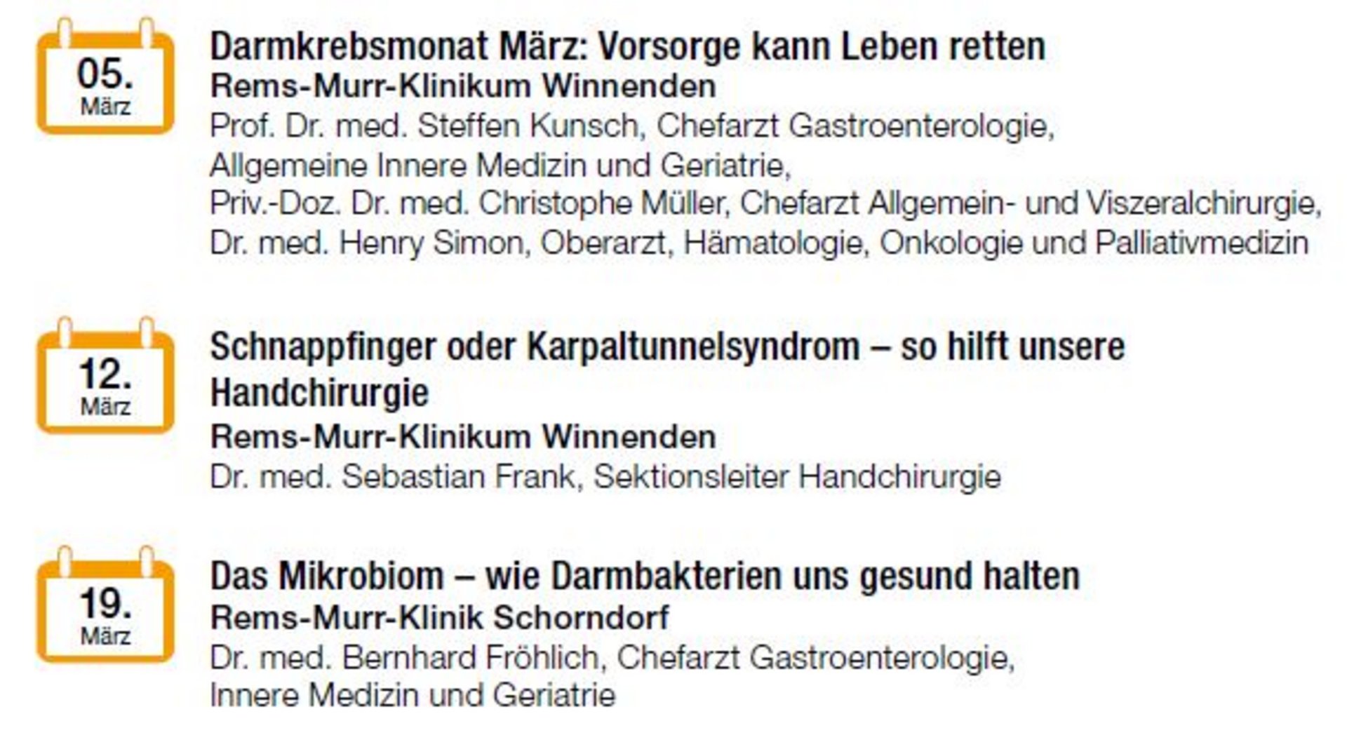 Die Rems-Murr-Kliniken bieten unter dem Titel „Medizin am Mittwoch“ regelmäßig Informationsveranstaltungen zu medizinischen Themen an. Der Eintritt zu den Veranstaltungen ist frei.
